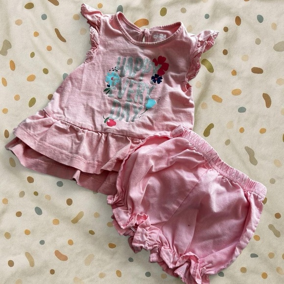 2 piece light pink outfit set from the Child of Mine line by Carter’s. comes with a ruffled top featuring a “happy every day” graphic on the front + ruffled hem shorts to match 💞