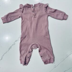 Adorable pink one piece with ruffled shoulders. Long sleeves and snap closures for easy dressing.
