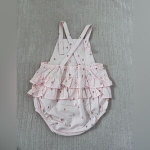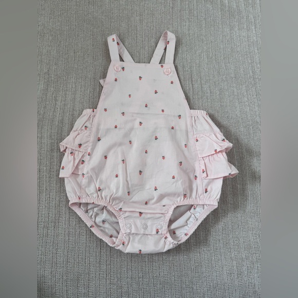 Pink ruffled overalls with a playful strawberry pattern. Can be worn on it’s own or with a shirt underneath. New without tags, never worn before. Comes from a smoke-free household. Feel free to message me with any questions! :)