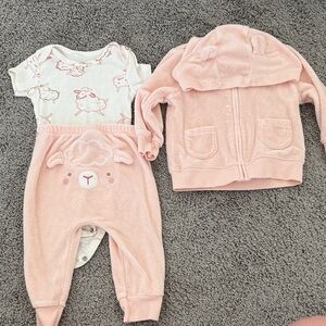 Adorable pink matching set with sheep design. Includes a bodysuit, pants, and hoodie. Soft and cozy material.