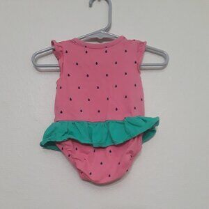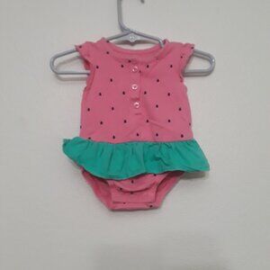 Adorable pink bodysuit with green ruffle. Button front design. Perfect for playtime.