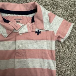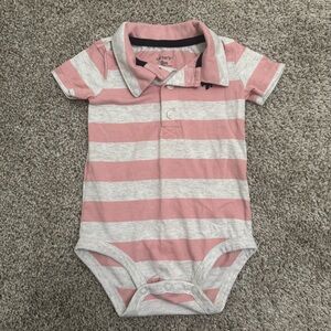 Adorable Carter's baby onesie featuring pink and gray stripes. Perfect for keeping your little one stylish and comfortable.