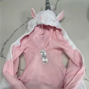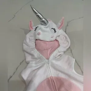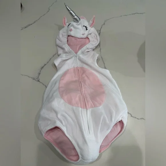 Adorable unicorn costume by Carter's. Features a soft hood with ears and a cute pink belly. Perfect for Halloween fun.