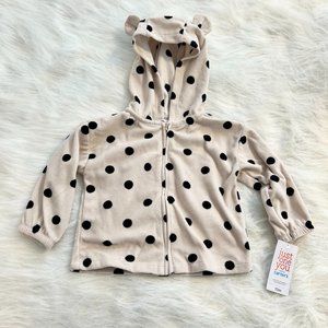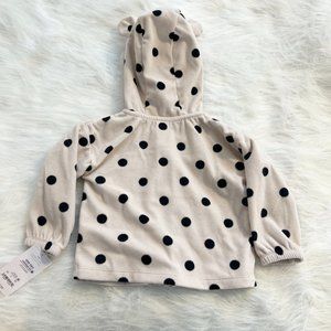 This NWT soft Carter's Polka Dot Hoodie in a size 12 mo. is soft and sweet. It zips up the front. Cute with the black dots and ears on the hood, it is reminiscent of a Dalmatian dog!