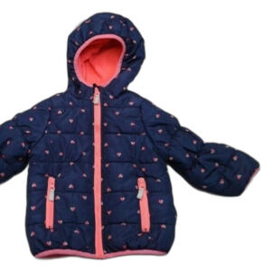 Carter's Toddler Puffer Coat with Hood in Dark Navy Blue with Bright Pink Fleece Lining and Pink & Silver Hearts design, Size 18 Months.