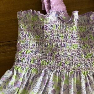 Sleeveless, straps with button closure and bow detail, smocked chest, triple tiered ruffle on hem, matching bloomers, green/white/purple floral print & contrasting purple and white polka dot print.