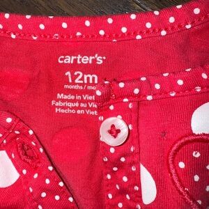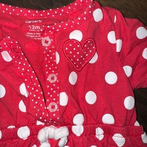 Charming red dress with white polka dots. Features heart accents. Ideal for little ones.