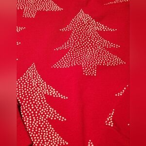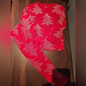 Festive red pajama set with white Christmas tree pattern. Perfect for the holiday season.