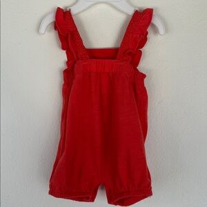 Coral red romper with eyelet detailing. Ruffled straps add charm. Soft knit fabric for comfort. Snap closure for easy changes.