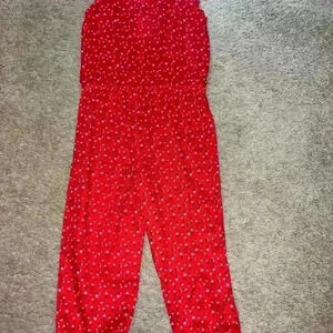 Adorable red one piece with playful polka dots. Sleeveless design. Perfect for kids. Worn minimally.