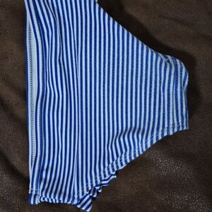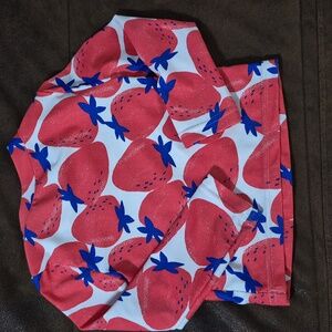 Charming swim rashguard with red strawberry design. Includes striped bottoms. Ideal for beach days. slight wear on back of bottoms.