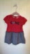 Charming red dress with heart pattern. Blue and white striped skirt. Perfect for casual outings.
