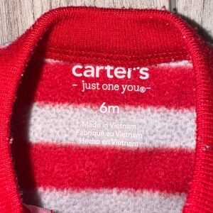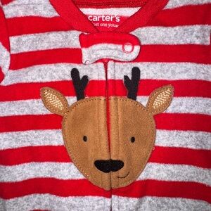 Charming one piece with red and gray stripes. Features cute reindeer accents. Cozy and stylish for little ones.