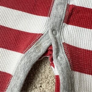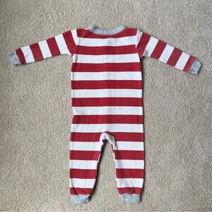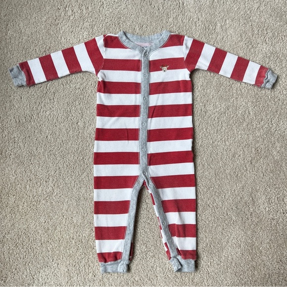 Pre-loved condition button / snap up pajamas or one-piece. Adorable worn in look, slight pilling and one stain at the top of the legs in the front - photos shown. Reindeer detail 🎅