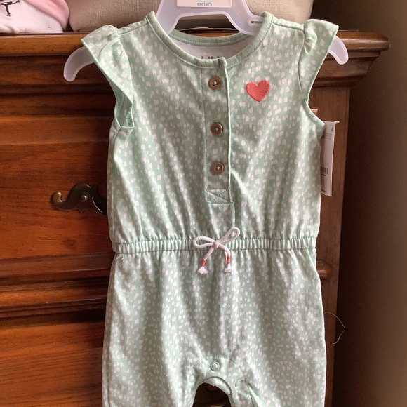 #carters #romper #babyromper #baby #girl #babygirl #sage #green #polkadots #heart #pink #pinkheart #summer #NWT #newwithtag