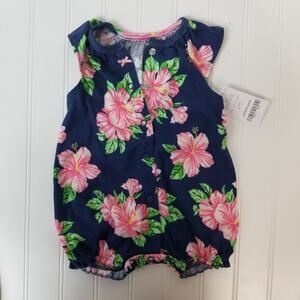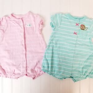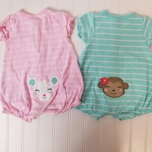 Carters brand, 4 rompers all size 3 month. Gently used, no holes or stains. 2 front snap striped rompers, one blue and white with money, the other pink and white with mouse. Floral print, back buttons, that is new with tags. Floral print with front buttons and elastic waist band.