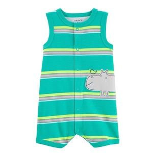 Lion pattern snap up romper. Green striped hippopotamus snap up romper. Black and white striped sailboat snap up romper.