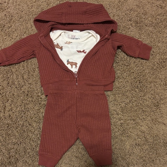 Cozy knit hoodie and pants set. Includes a playful printed onesie. Perfect for comfort and style.