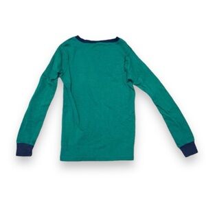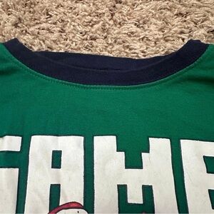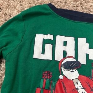Fun kelly green long sleeve pajama top with navy blue knit piping at neckline and cuffs from Carter’s. The graphic across the front reads “Game on Santa!” with an illustration of Santa Claus playing video games.