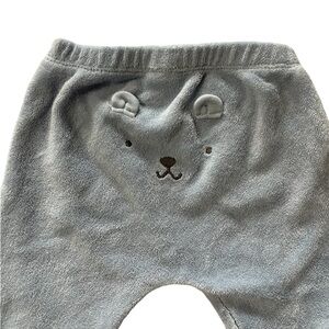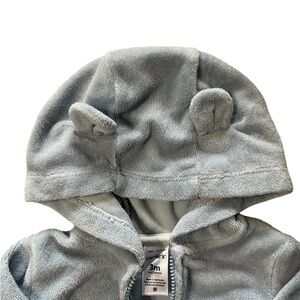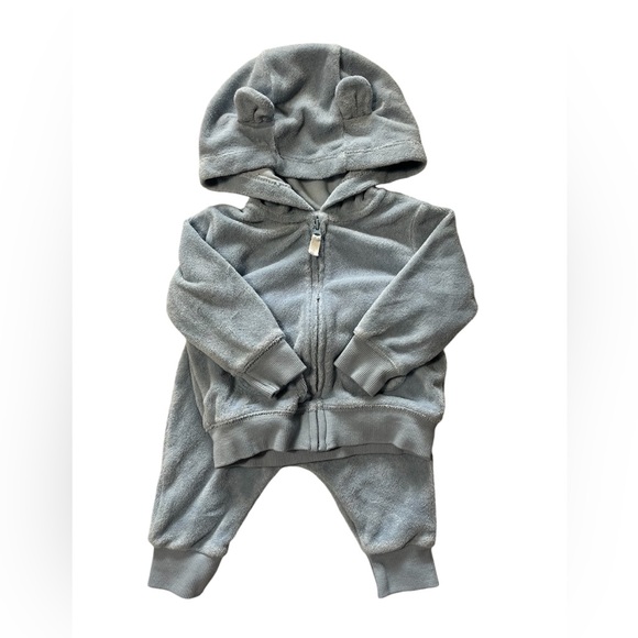 Very good condition. Adorable terry material jogger set! The hood has ears and there’s a little bear face on the butt. Zipper closure on the hoodie. The color is light blue; It’s not as dull as my poor lighting makes it appear.