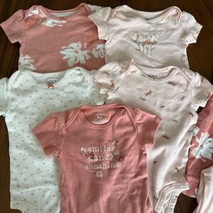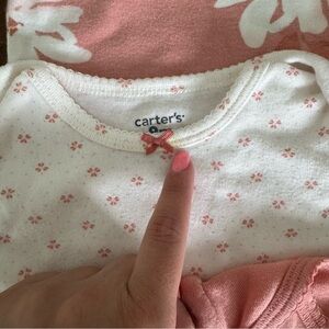 Charming baby outfit set by Carter's. Includes 5 bodysuits with pink floral patterns and 2 pink leggings. Features a cute bow detail. EUC, size 9M.