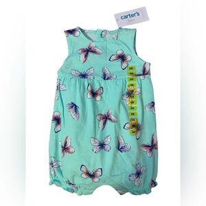 2 piece set of baby outfits from Carter’s, so cute and soft! A pink striped dress with little bloomers underneath & a green one piece short outfit with butterflies.