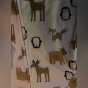 White fleece like materials with northern woodland animals. Zippered with grippy feet