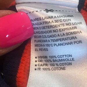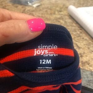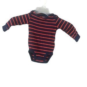 Carter's size 12 months long sleeve blue and orange onesie with snap closures. It is 100% cotton and in excellent condition with no issues.