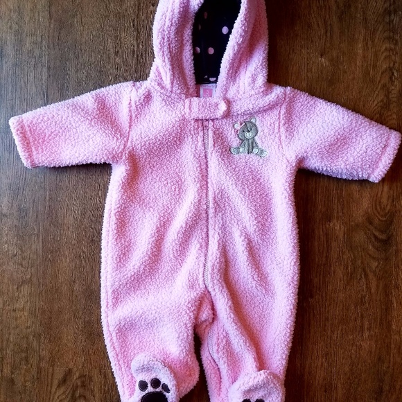 Adorable snowsuit from Carter's, size 6 months. Bottoms of feet are gripped bear paws. Top of hood has ears.