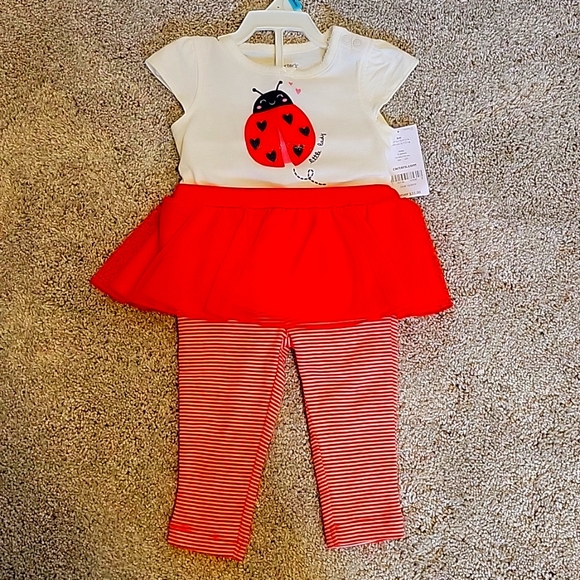 6 months size. 100% cotton top (onesie) and bottom. Never worn - with tags.