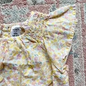 Carter’s girls floral flutter sleeve top with elastic hem and single button closure at back. Yellow floral print. In like new condition.