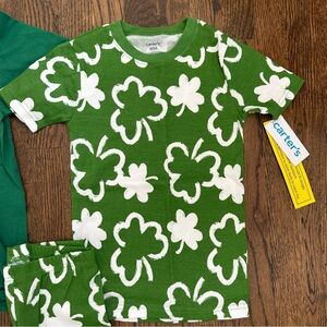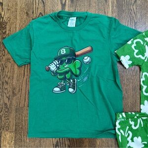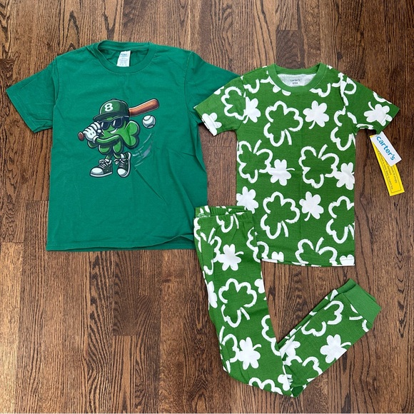 NWT shamrock pajamas from Carters. Shamrock playing baseball tshirt from Amazon. Pjs size 8, tshirt size medium.
