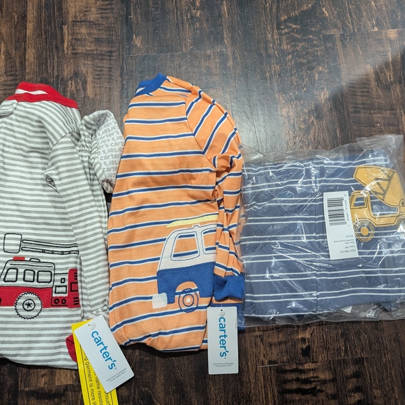 Three pairs of Carter's footie knit pajamas featuring vehicle designs. All NWT and 24 months.