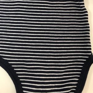 Blue and white stripe onsie, with waffle like texture. 3 usable buttons at neck. Navy trim. Great condition.