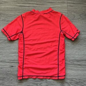 Vibrant red rashguard with 'Surf Dude' print. Short sleeves. Easy to wear.