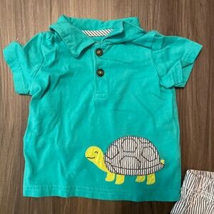 Teal shirt with turtle design. White striped shorts with drawstring.
