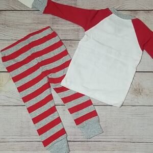 2 piece pajama set with raglan style long sleeve top and red and grey striped pants.