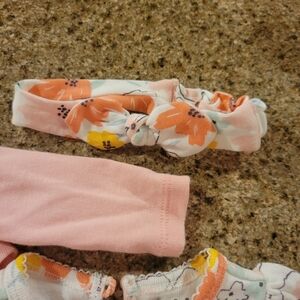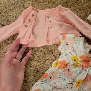 Three pieces - shortsleeve onesie with overlay skirt layer, headband hair bow and cardigan. Adorable for newborn photos, sip and see, any special occasion where you are showing off baby.
