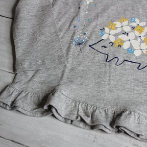 This two-piece lot includes a long sleeve tunic top and a pair of knit denim blue leggings. The top is gray with white and golden yellow flowers with blue and navy accents. The hedgehog is blowing dandelion flowers and making a wish. Both items are size 3T and are brand new with tags.