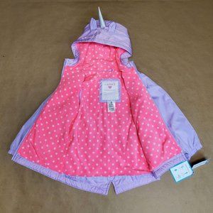 A great jacket for your little one who loves unicorns. This midweight anorak jacket from Carter's is perfect for chilly days and nights because it is lined with soft fleece. This jacket features a zip up front, two front pockets, unicorn ears and horn on the hood, and an embroidered unicorn on the top left front. Jacket is also water resistant and protects from wind.