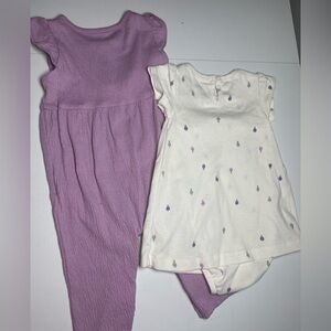 Adorable baby outfit set featuring a white dress with colorful patterns and a purple romper with button details. The white dress fabric is so soft! Washed in Dreft once, never worn. Smoke free, dog friendly home.