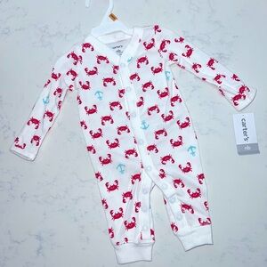 Adorable Carter's one piece featuring a playful red crab print on a white background. Perfect for your little one's comfort and style.