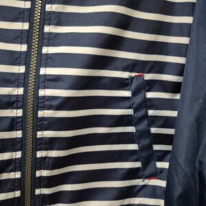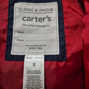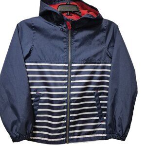 Carters' windbreaker jacket size 8. Classic red, white & blue. Hooded protection from elements, water resistant and relax fit. Zipper closure and front pockets. Pre-owned, in good condition, no tears, stains or snags.