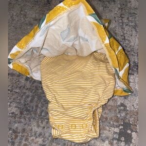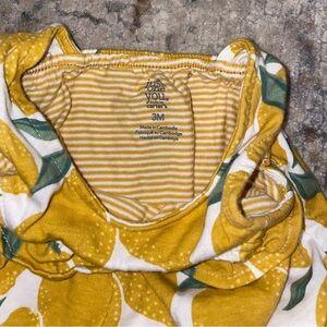 Charming lemon print dress. Sleeveless design. Includes matching bloomers.
