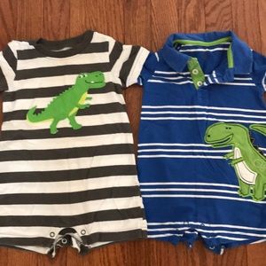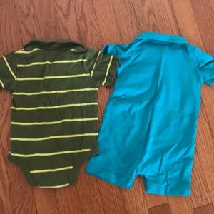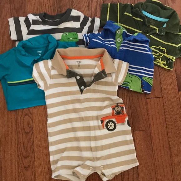 5 carters onesies with snap buttons. All 12 months. They all have the “shorts like” bottom except dark green one which is a regular onesie bottom. No stains. Great used condition. Cream and beige monkey onesie has slight piling and fuzzies.