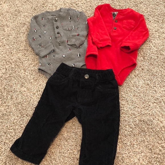Two onesies with one pair of corduroy black pants