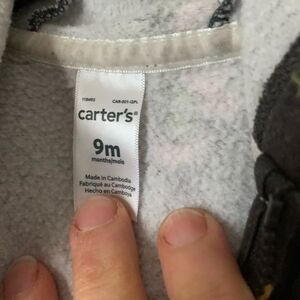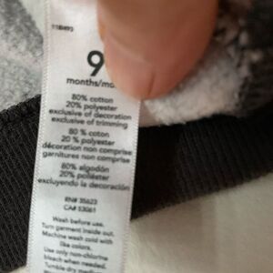Carter’s dark grey distressed floral pattern 2-piece set: cuffed pants and hoodie, size 9 months. Used but in good condition. Adorable.