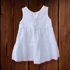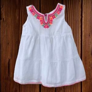 Adorable and brightly colored BoHo Mexican style embroidered gauze dress. Brightly colored embroidery around neckline and rickrack hemline. Perfect for a Cinco de Mayo fiesta.