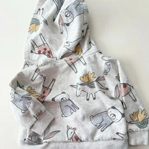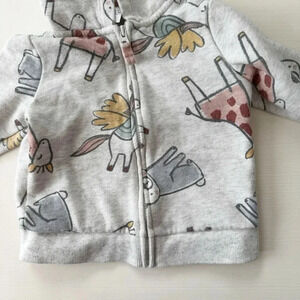 Cute little light gray zip up with unicorn animal print. Made with cotton and poly. No flaws, good preowned condition