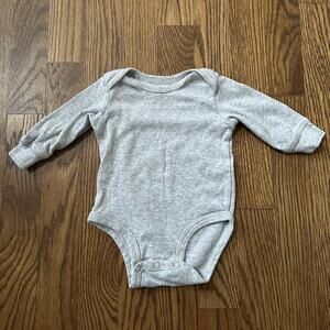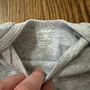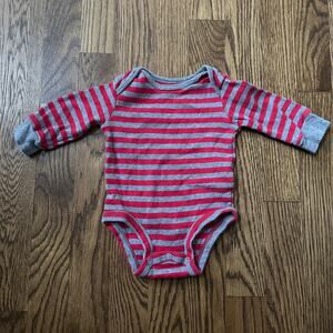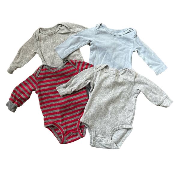 4 long sleeve onesie bodysuits from Carter’s. 2 light grey, 1 light blue, 1 red and grey striped. Fold over shoulders for easy removal. Bottom snaps.